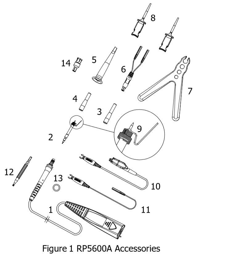 The RIGOL RP5600A passive probe provides up to 600 MHz bandwidth and uses modular structure allowing users to replace the probe tips. The probe has compact structure and uses snap-on BNC connector for easy connection with the oscilloscope.